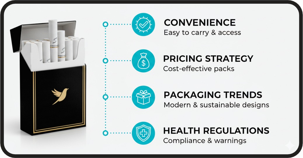 Some countries have plain packaging laws in which the branding is removed and the health warnings are large. Others have prohibited packs of smaller than 20 to prevent teens from being able to afford them. Taxes also have an influence on pack sizes and prices. Per-stick taxes make big packs more expensive but less expensive per cigarette.Companies construct strong boxes that are cost effective and abide by the rules.